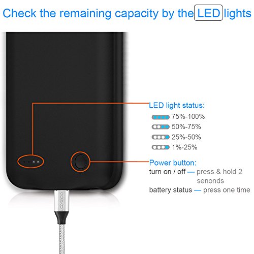 LED light design can easy to check the remaining power and charging status. Connect your iPhone to the battery case, press and hold the power button in 2 seconds then start charge. Note: The 4 LED lights will be off when the iPhone battery pack get fully charged.