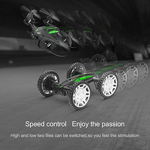 Air-Ground Modalità Dual: Funzione Ground Mode, la macchina è fatta come una macchina di controllo remoto con funzionamento ad alta velocità durante l’assunzione di foto e video, pratico controllo WiFi, 180 ° flips. Funzione Flight Mode, la macchina è fatta come un quadcopter con funzione di Hold altitudine, un pulsante di start / landing, Cámara FPV, headless mode.