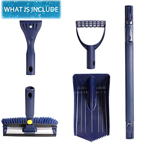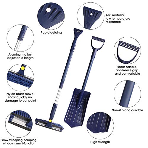 4-in-1: Il set di strumento di rimozione della neve comprende un pennello neve, un raschietto del ghiaccio, una testa pala da neve, una biella e un manico. È possibile combinare loro uno e l’altro in un modo libero di trattare con varie occasioni. Si possono usare per aiutarti a lavorare fuori un sacco di problemi di rimozione di neve e ghiaccio, per esempio, pala la neve, spazzare la neve e raschiare il ghiaccio sul patio del cortile ..