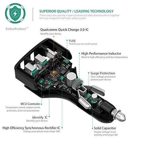 Caricabatteria Pratico 1+2 : Una porta Tipo-C con Tecnologia di Quick Charge 3.0 e due porte con Tecnologia di AiPower (3A max per ogni porta), per soddisfare tutte le esigenze della ricarica nell’auto;
