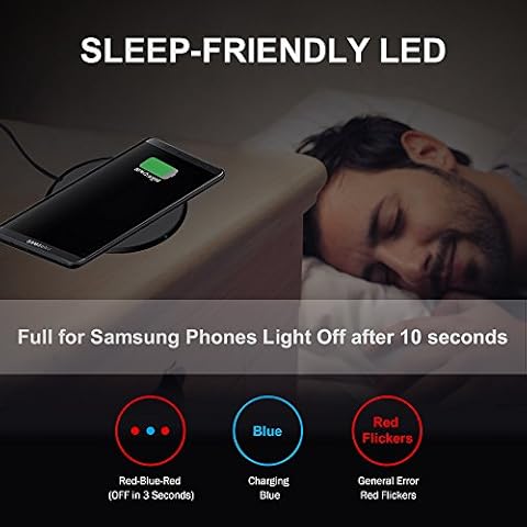 INDICATORE LED PER CAPIRE LO STATO DI RICARICA – Sulla parte frontale è ben visibile un indicatore led, quando il caricatore wireless è collegato con il cavo USB e adattatore per la presa corrente(non incluso), si accende la luce rossa, si accende la luce led blu quando in ricarica, quando il telefono è carico completamente smette da solo
