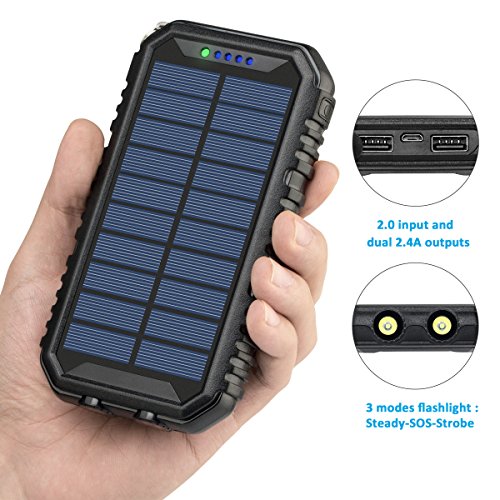 Caricatore solare esterno perfetto: impermeabile IP67, resistente alla polvere e agli urti. Processo rugoso sulla superficie per evitare scivolamenti. caricatore leggero con gancio, facilmente appenderlo allo zaino. Scelta perfetta per il campeggio, l’escursionismo e varie attività all’aperto.