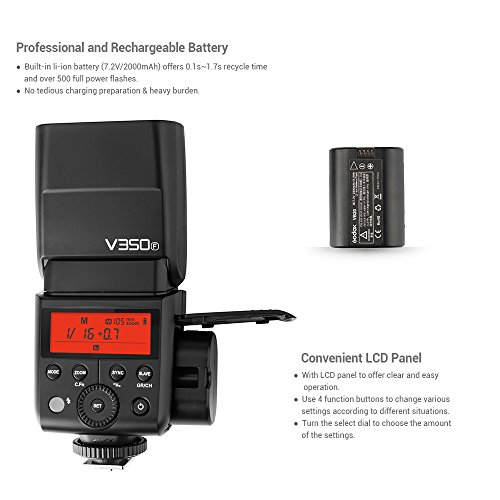 La batteria agli ioni di litio da 7,2 V 2000 mAh integrata offre tempi di riciclo di 0,1 s-1,7 s e oltre 500 lampi di piena potenza e viene fornito con caricabatterie per una comoda ricarica.