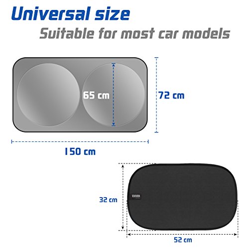 ☀ MISURA MISURA FLESSIBILE: misura prima dell’acquisto per ottenere la migliore dimensione per il parabrezza della tua auto. 1 confezione da 150 x 72 cm parabrezza per auto è L 149,86 x 71,88 W ed è per parabrezza anti-vento che NON SUPERARE 150 * 72 cm. Disponibile per auto / SUV / camion / furgone. 2 confezioni di vetri per auto universali da 50 x 30 cm con buona aderenza e raffreddamento, 80 blocchi GSM raggi UV al 98% / sole / abbagliamento per proteggere il sedile posteriore. Adatto per tut