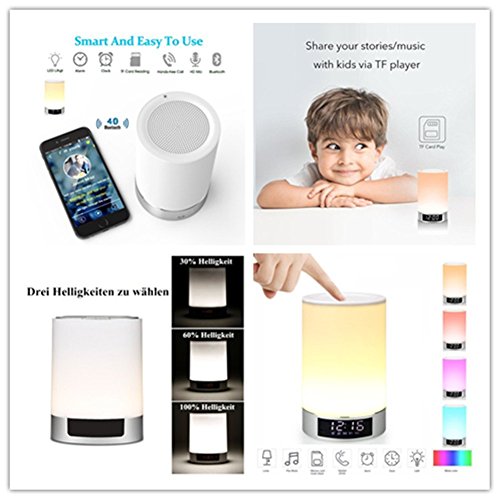 🌃【 ALTOPARLANTE BLUETOOTH + TOUCH LED LAMPADA + SVEGLIA + LETTORE MP3 】4 in 1, Connessione / accoppiamento super facile con Bluetooth 4.0, compatibile con tutti i dispositivi abilitati Bluetooth. 3 Luminosità a LED calda regolabile a livello di luminosità (MAX 20 Lumen) con il design del sensore tattile in alto. modalità. Può essere utilizzato come lettore MP3 con ingresso USB e scheda di memoria.