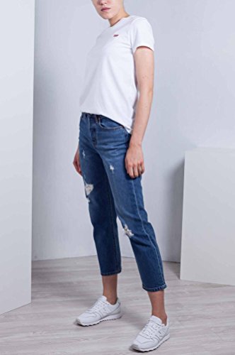 Pantaloni jeans per donna realizzati in cotone ed elastan, tessuto elasticizzato, vita alta, aderente dal fianco alla coscia con gamba dritta, chiusura con bottoni, passanti per cintura, design classico a cinque tasche, tasche aperte sul davanti con rivetti, Tasche applicate sul retro, fondi tagliati senza rifinitura e etichetta Levi’s sulla vita posteriore in pelle.