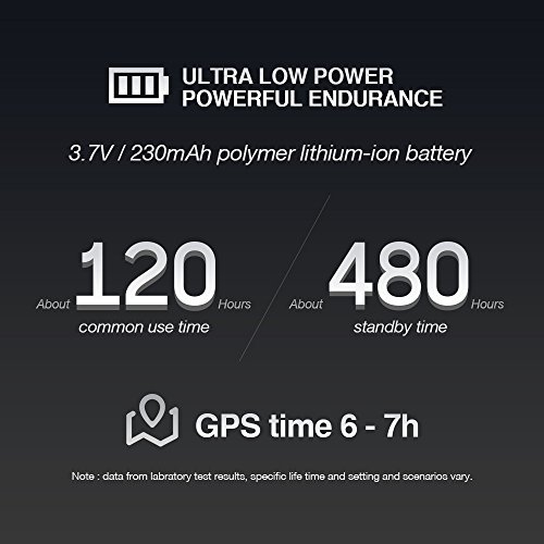 • Classe di protezione professionale IP68 • Per consentire il nuoto (evitare bagni caldi e vapore) Batteria agli ioni di litio polimerica da 3,7 V / 230 mAh, durata della batteria in modalità GPS da 6 a 7 ore, tempo di utilizzo comune fino a 120 ore, tempo di standby 480 ore