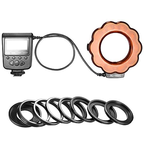L’anello luce riesce a soddisfare le esigenze fotografiche più elevate. C’è incluso un filtro arancione, realizzato in plastica a trasmissione alta di luce, che è leggero, stabile nella temperatura di colore e subisce poca perdita. La luce è alimentata da 4 batterie AA (NON incluse).