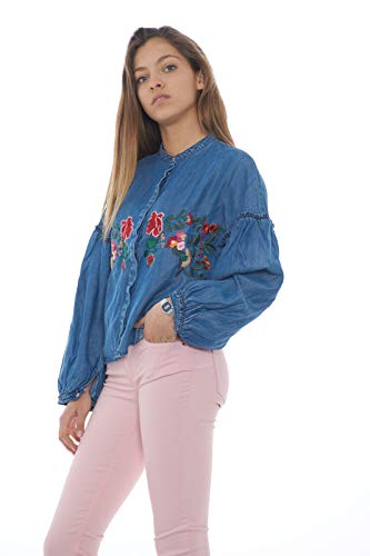 La camicia in jeans comoda e pratica con il suo ricamo multicolorato di fiori sulla parte anteriore da particolarità al capo.