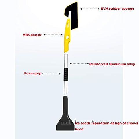 Caratteristiche: Realizzato in materiali di alta qualità, la maniglia adotta il design ergonomico, la testa pala e denti ghiaccio design split, l’asta di lega di alluminio possono essere regolati liberamente alla lunghezza, e può realmente ottenere la rimozione della neve senza pelo senza danneggiare la vernice macchina ..