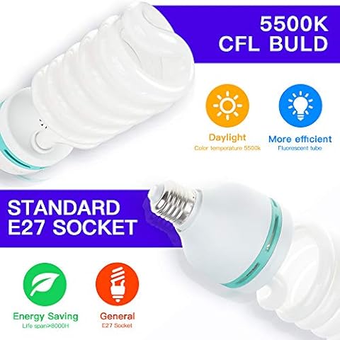 【2 * Lampadina E27 5500K】 La luce è diurna standard 5500K, può emettere anche una luce super delicata, così da lasciare il colore più realistico dell’oggetto fotografato. Con 2 due lampadine CFL a luce diurna, equivalenti a una lampadina a incandescenza da 800 W, si puó risparmiare l’80% di energia e la durata della vita della lampada puó arrivare fino a circa 8000H.
