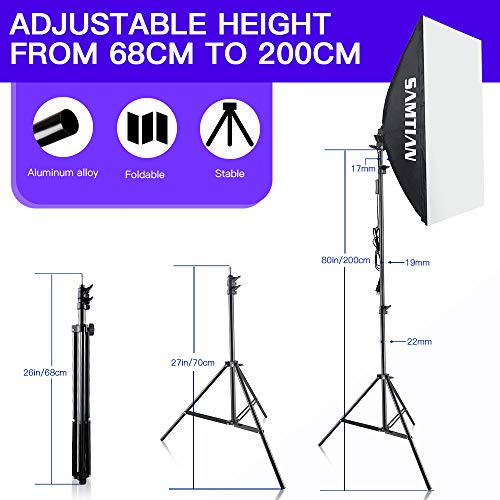 【Il kit include】 2 * 20×28 “/ 50×70 cm softbox + 2 * panno morbido + 2 * 5500K attacco E27 bulbo + 2 * 2 m supporto luce + 1x borsa da trasporto (offriamo 365 giorni di reso gratuito, se avete domande sui nostri prodotti, per favore sentitevi liberi di contattare il nostro servizio clienti)