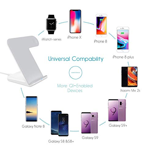 Ricarica veloce & modelli compatibili: iPhone docking station consente di caricare i vostri dispositivi 40% più veloce rispetto a standard caricabatterie Wireless, compatibile con Apple Watch Series1/2/3, Sumsung S9/S9 Plus/S8/S8 Plus/S7/S7 Edge/Note 8/Note 5/S6 Edge Plus S6/edges6/Nokia/HTC/LG. Inoltre, è anche compatibile con tutti i dispositivi abilitati con velocità di ricarica standard.