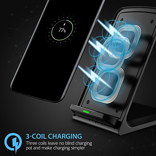 Indicatore LED intelligente: intelligente indicatore LED mostra lo stato di ricarica La sicurezza. Il supporto di ricarica wireless si trasformerà in blu quando si collega l’ alimentazione, e si trasformerà in verde e rimane quando inizia a caricare il telefono.