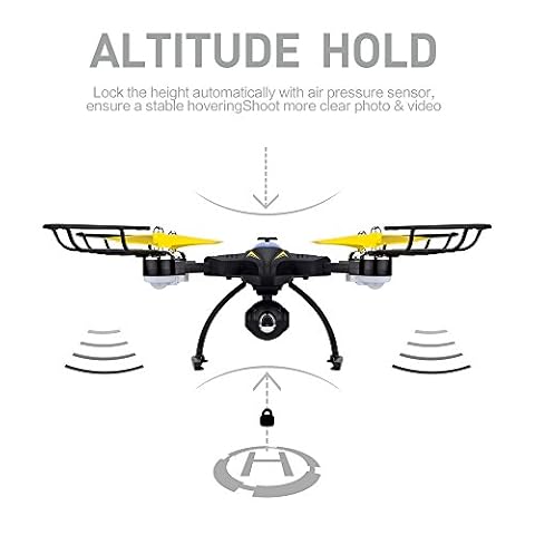 【Funzione di sospensione altitudine】 Modalità di volo più facile per i principianti o i bambini: la modalità significa volare il drone ad un’altitudine specifica e adotta il barometro per realizzare questa funzione. In questa modalità è possibile effettuare il volo del drone nell’altezza predefinita e passare in posizione veloce, è possibile scattare immagini in qualsiasi angolo, più adatto a controllare i principianti.