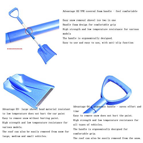 * Funzionamento facile: dimensioni ridotte, facile da smontare, quando non in uso, inserito nel bagagliaio dell’auto, non è facile da occupare il terreno. Montato rapidamente durante l’uso, la biella può essere allungata a 115 cm e può anche essere utilizzata per rimuovere la neve dal tetto.