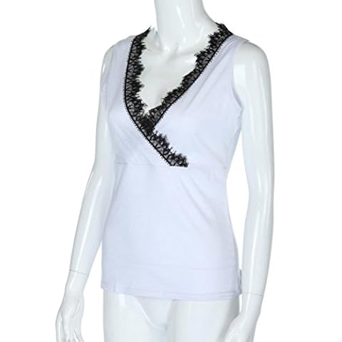 Canotta Donna Estivi Eleganti Canottiera Splicing Pizzo Tops Ragazza Senza Maniche V Scollo Slim Fit Tank Top Puro Colore Blusa Casuali Mare