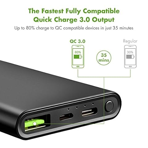 LA RICARICA PIÙ VELOCE QUICK CHARGE 3.0 PIENAMENTE COMPATIBILE: Ricarica un dispositivo QC compatibile fino all’80% della capacità della sua batteria in appena 35 minuti. La powerbank supporta le tecnologie Qualcomm’s 2.0/3.0?HUAWEI FCP?MTK PE1.0/2.0?Samsung BC1.2?Apple Quick Charge. Chiaramente, QC 3.0 è retrocompatibile con le tecnologie Qualcomm Quick Charge 1 e 2