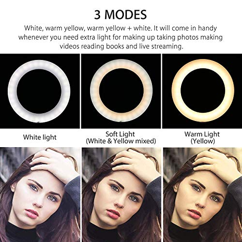 ☘【Luce anulare dimmerabile】 Il cavalletto con luci ad anello da 6,3 pollici.3 modalità di illuminazione a colori: bianco, giallo caldo e bianco caldo. Ogni modalità di illuminazione ha 11 luminosità regolabile tra cui scegliere, soddisfare tutte le esigenze in diverse circostanze. È la perfetta illuminazione dimmerabile diurna per portare via tutte le ombre poco lusinghiere!